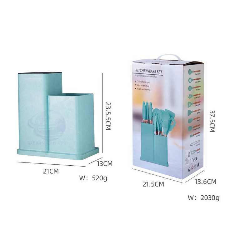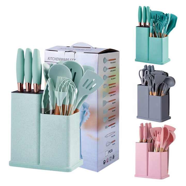 Newest 19-piece Set of Silica Gel Kitchen Utensil Set with Wooden Handle and Cuttings Board Storage Bucket Kitchen Gadget Set