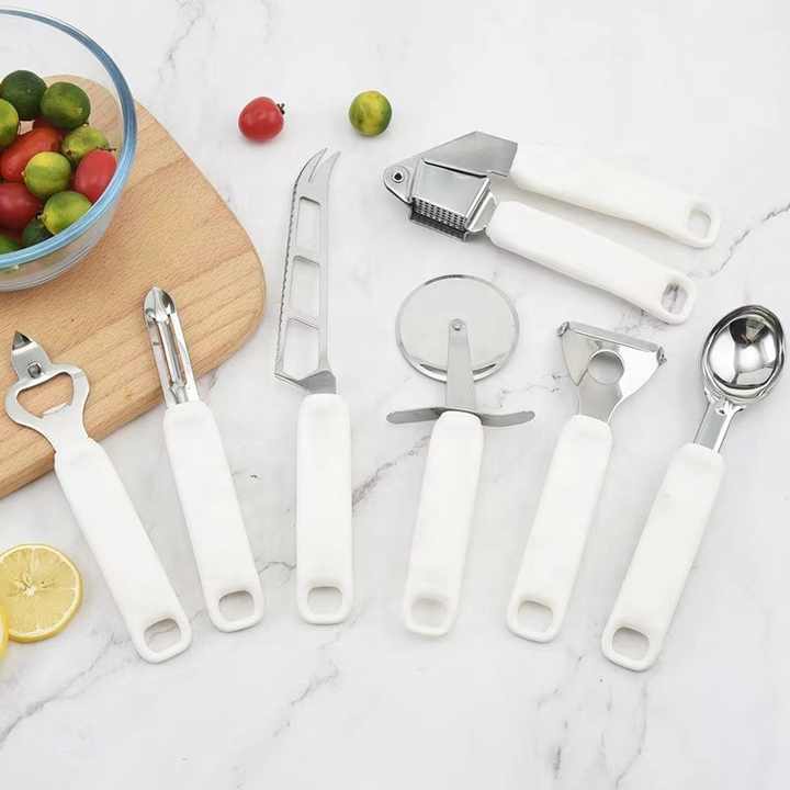 Stainless Steel Kitchen Gadgets Garlic Stripper Bowl Holder Bottle Opener Whisk White Handle Kitchenware Set