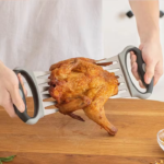 The accompanying images show real life scenarios of using the claws on a roasted chicken, highlighting their practicality and ease of use in the kitchen.