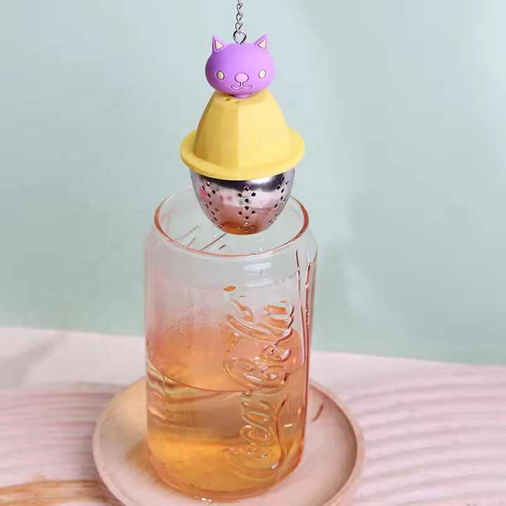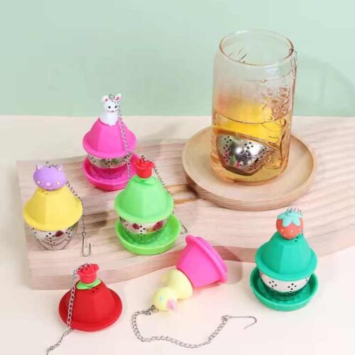 These tea infusers feature vibrant silicone tops in colors like pink, yellow, red, and green, adorned with cute animal and fruit – shaped decorations such as a duck, cat, rabbit, bear, rose, and strawberry.