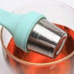 These tea infusers feature a sleek, minimalist design with a light turquoise silicone handle and top, paired with a stainless steel mesh body.