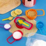 Comes in a variety of bright colors, including red, purple, orange, green, and blue. The different colored cups and spoons are visually appealing and easy to distinguish.