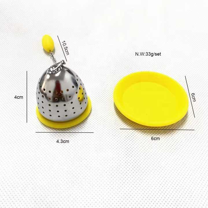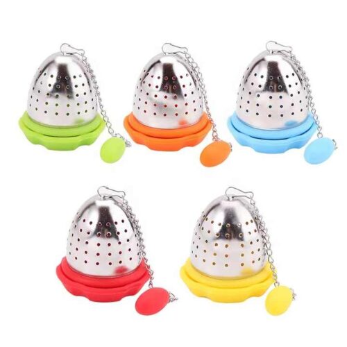 These tea infusers feature a bell shaped stainless steel body with colorful silicone bases in green, orange, blue, red, and yellow. Each comes with a chain and a silicone tag.