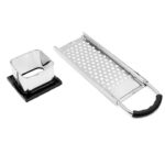 Features a sleek, metallic looking structure with a black accented handle, combining a grater and a slicer in one compact unit for versatile kitchen use.