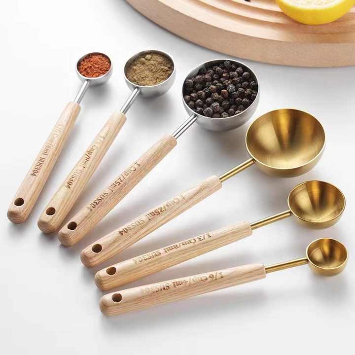304 Stainless Steel Measuring Spoon Creative Wooden Handle Coffee Tea Spice Powder Measuring Spoon with Graduated Baking Spoon