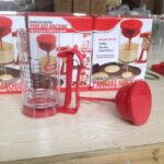 Features a striking red handle and lid, contrasting with the clear plastic body, making it easy to spot in the kitchen.