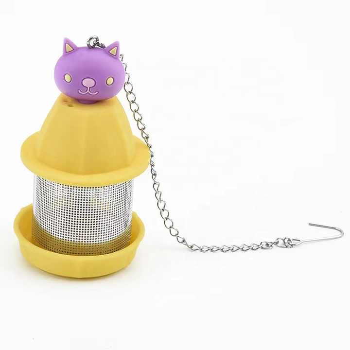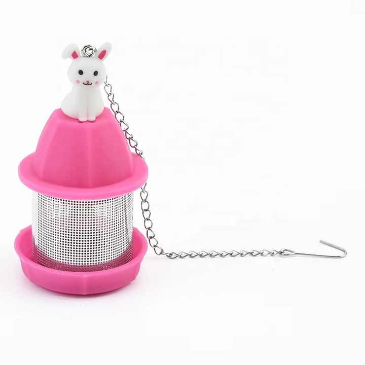 These tea infusers come in a variety of vivid colors like pink, green, red, and yellow. Each is topped with cute decorative elements, such as a cat, duck, rabbit, strawberry, and bear, adding a playful touch.