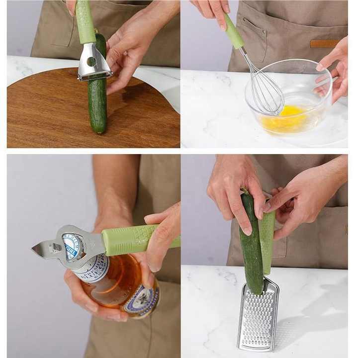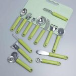 This set includes various essential kitchen tools such as spatulas, a pizza cutter, a peeler, and tongs, catering to different cooking and food preparation needs.