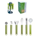 Features a striking combination of gray and bright green colors. The tools are neatly arranged on a stand with a spherical top, giving it a modern and space-saving look.